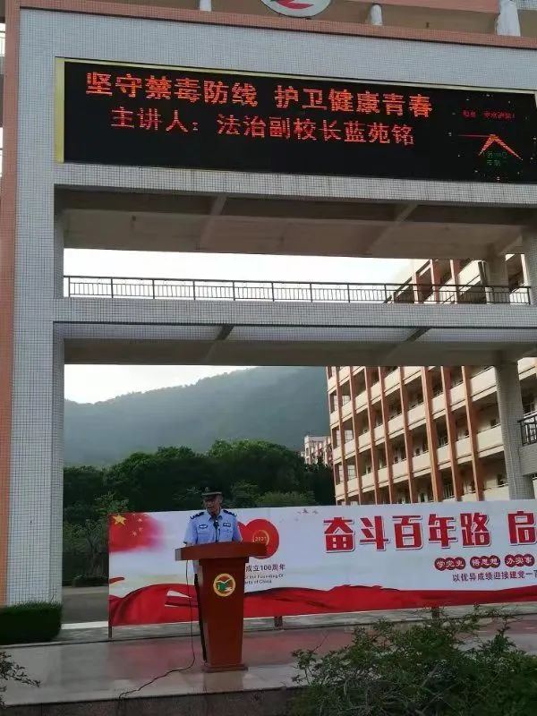 6月28日,阳春市第一中学法治副校长、阳春市公安局副大队长蓝苑铭到该校开展“坚守禁毒防线,护卫健康青春”主题法治讲座。