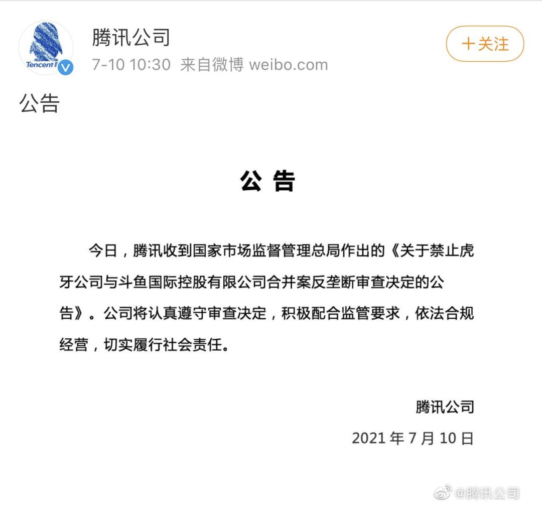7月10日上午,@腾讯公司 官方微博发布公告称:今日,腾讯收到国家市场监督管理总局作出的《关于禁止虎牙公司与斗鱼国际控股有限公司合并案反垄断审查决定的公告》。公司将认真遵守审查决定,积极配合监管要求,依法合规经营,切实履行社会责任。