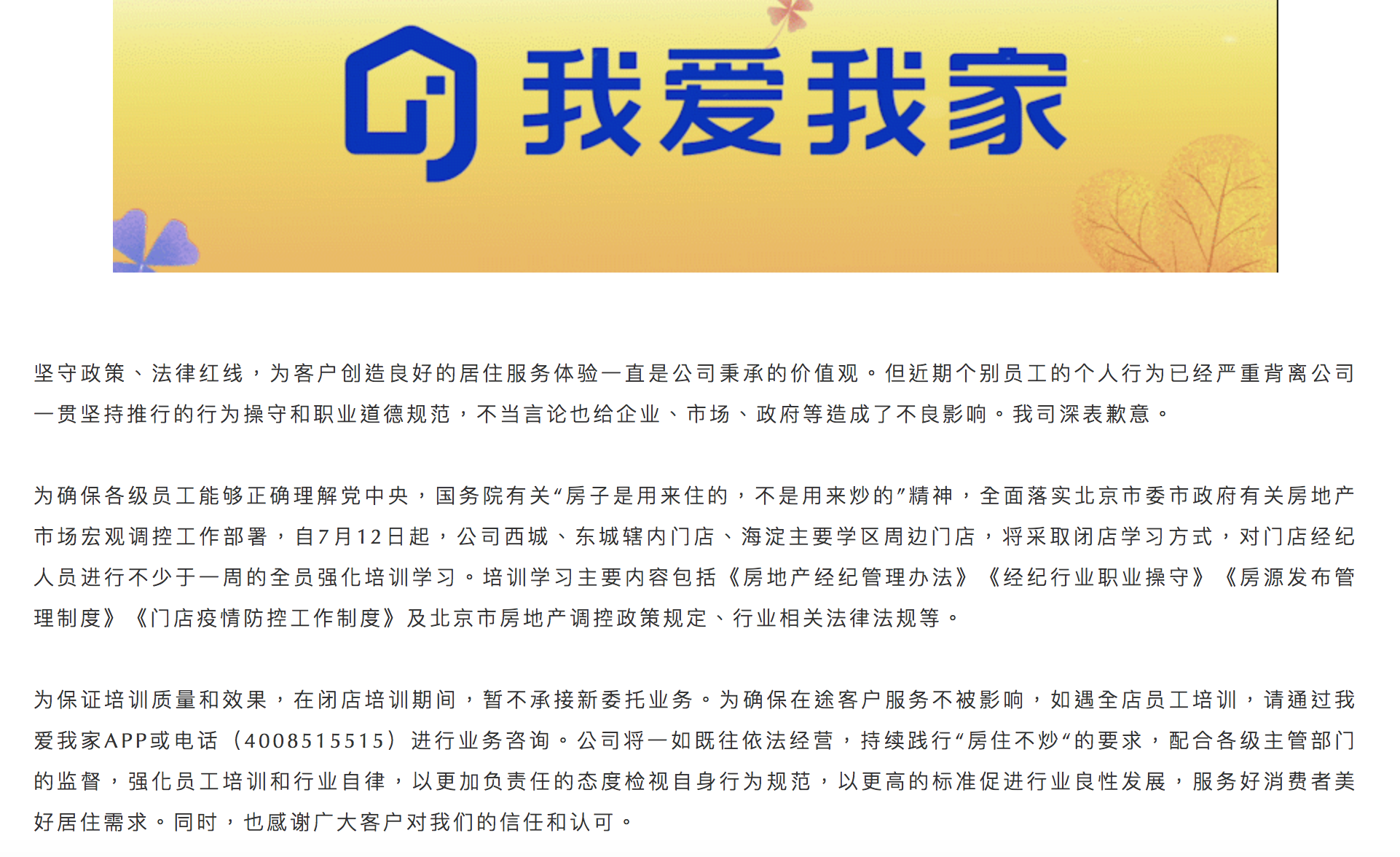 7月9日,北京我爱我家房地产经纪有限公司在其官方微信号上发布“致客户的一封信”称,坚守政策、法律红线,为客户创造良好的居住服务体验一直是公司秉承的价值观。但近期个别员工的个人行为已经严重背离公司一贯坚持推行的行为操守和职业道德规范,不当言论也给企业、市场、政府等造成了不良影响,深表歉意,并表示自7月12日起部分门店将采取闭店学习的方式,对门店经纪人进行为期一周的全员强化培训。我爱我家指出,为确保各级员工能够正确理解党中央、国务院有关“房子是用来住的,不是用来炒的”精神,全面落实北京市委市政府有关房地产市场宏观调控工作部署,自7月12日起,公司西城、东城辖内门店,海淀主要学区周边门店,将采取闭店学习方式,对门店经纪人员进行不少于一周的全员强化培训学习。在闭店培训期间,暂不承接新委托业务。