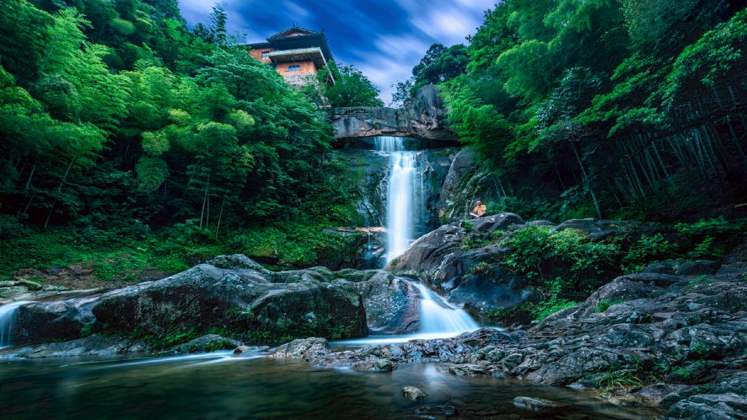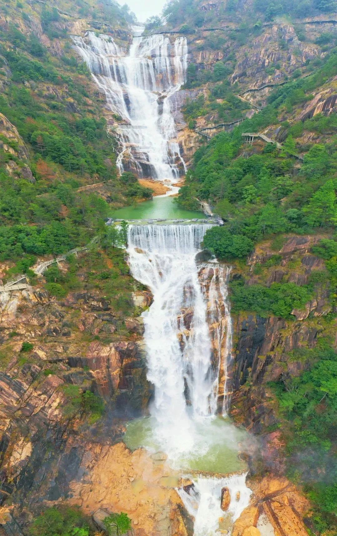 “赤城霞起而建标,瀑布飞流以界道”,天台山大瀑布,位于天台境内的桐柏山西麓,主体大瀑布总落差325米,最大宽度90米,是个罕见的高落差亲水梯级瀑布群,堪称中华第一高瀑。神仙居景区