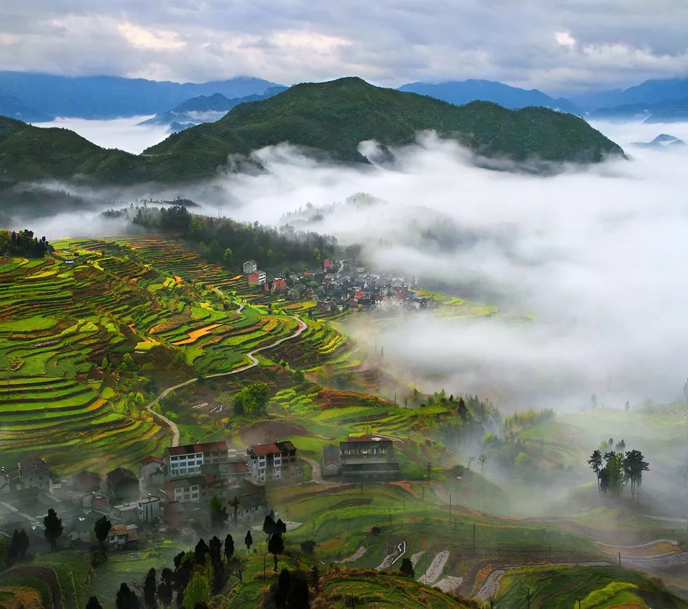 秋季的杨丰山上,阳光懒洋洋地洒在瓦片铺的屋顶上,竹林花海映衬着山居古宅,高山梯田上一片金黄,层层叠叠,仿佛铺层在天地间的织锦,令人叹为观止。蛇蟠岛