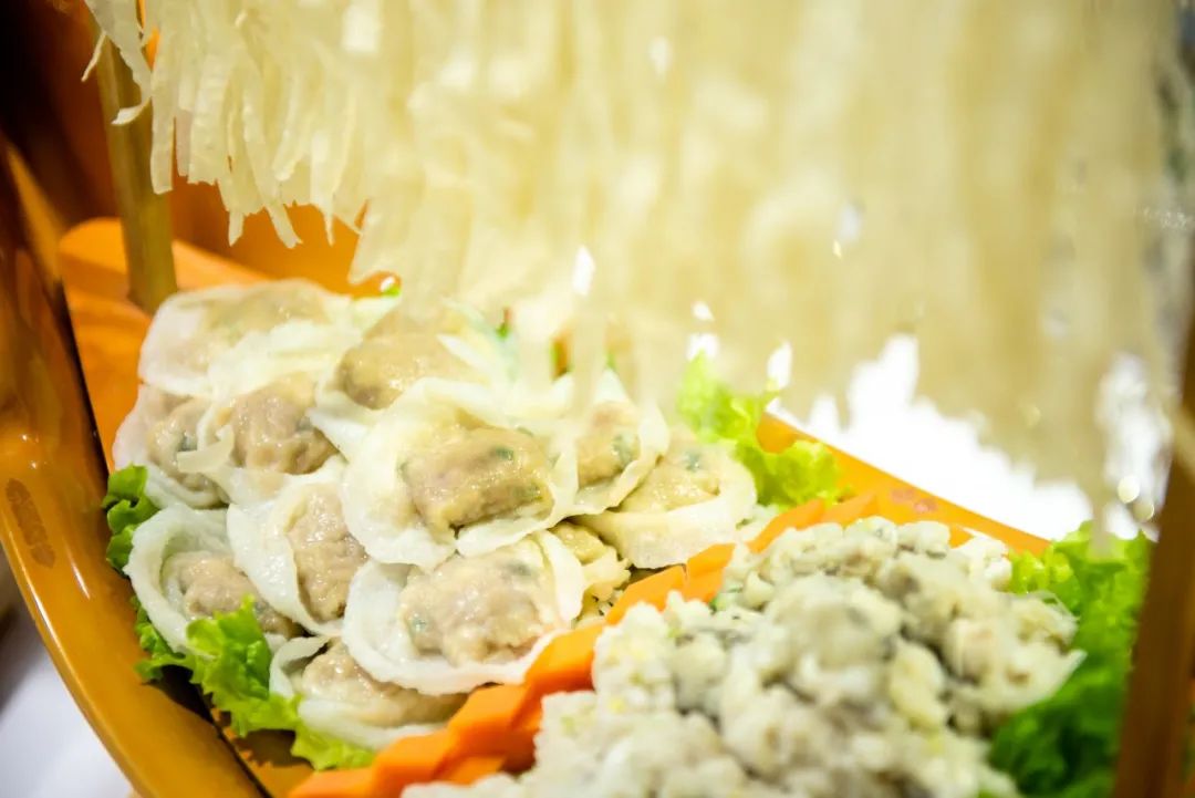 敲鱼面、敲鱼馄饨是台州玉环一带的特色面食,面皮是鱼肉和面粉敲打出来的。特色就在于看不出是鱼,却吃出浓浓的鱼鲜味,不同的鱼也是不同的面,鲜美得不得了。蛋清羊尾