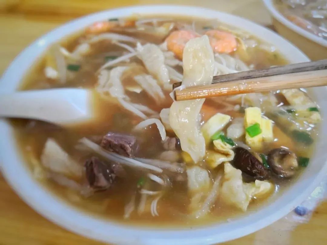 台州的糟羹有咸甜之分,一碗咸糟羹,融合着冬笋、香菇、蘑菇等山珍,还有干贝、虾干、蛏肉、牡蛎等海味,看似普通,实则极致鲜香;甜糟羹则由湿淀粉、苹果、红枣、小汤圆、桔饼、红糖等做成,甜甜蜜蜜,暖心暖胃。姜汤面