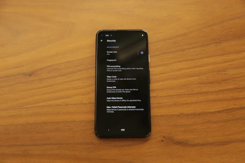 这款手机提供了「PIN scrambling」功能,PIN 输入屏幕会随机重新排列数字,可能会阻止第三方在看到某人输入密码时查出该设备的密码。屏幕顶部的状态栏包括一个快捷方式,用于显示手机上的擦除功能,并带有一个图标,图标显示一张纸正在通过碎纸机。用户还可以设置一个「擦除代码,wipe code」,该代码将从锁屏上擦除设备。