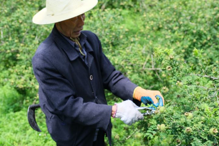 这位家住贵州六盘水市水城区野钟乡野钟村的老人,每天推开门,即可见到乡里大片的刺梨园。他每天戴上遮阳的草帽和手套,到自家的刺梨园里修剪多余的枝叶。他有着40多年的从医经验,2015年开始,他在家门口靠种刺梨为生,收入是以前种玉米的3倍。