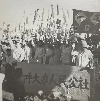 ▲上海县七一人民公社成立大会上社员群众振臂欢呼大办人民公社。1958年9月21日