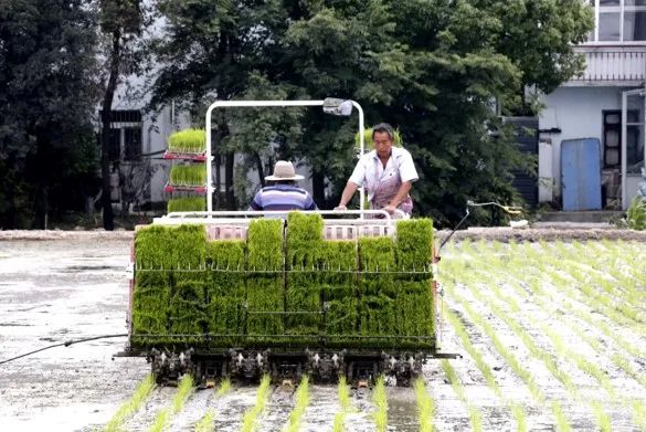 ▲闵行区实现水稻插秧的机械化操作。2019年6月