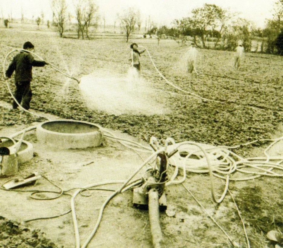 ▲农民使用水泵、水管等为菜田浇水。20世纪70年代