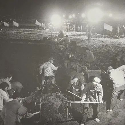 ▲上海县虹桥人民公社干部、社员挑灯夜战改造蔬菜地。1975年12月