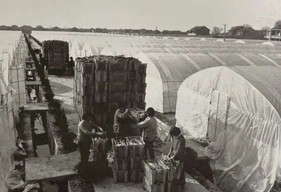 ▲上海县虹桥乡农业公司为延长蔬菜供应期,建成12个管棚群和1个中棚群。1989年从面朝黄土背朝天的露地生产,到建设塑料薄膜大棚,再到如今一个个高科技的智能玻璃大棚,闵行农业实现了从看天吃饭到稳产高效、旱涝保收的根本性改变。