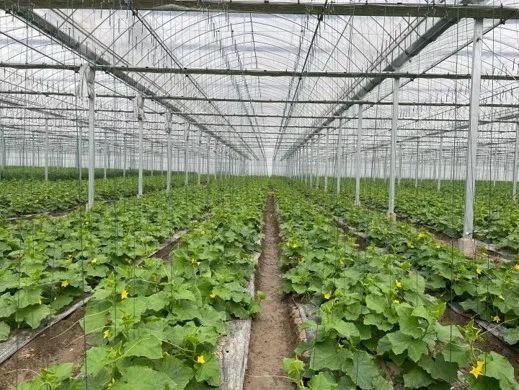 ▲新型的联栋大棚更有利于蔬菜生产规模化管理和机械化作业。2019年4月