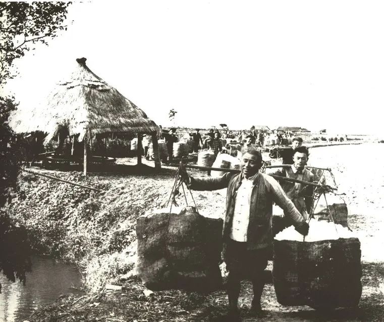 ▲上海市西郊区黎明合作社稻谷丰收,社员们肩挑稻谷,满载而归。1957年11月