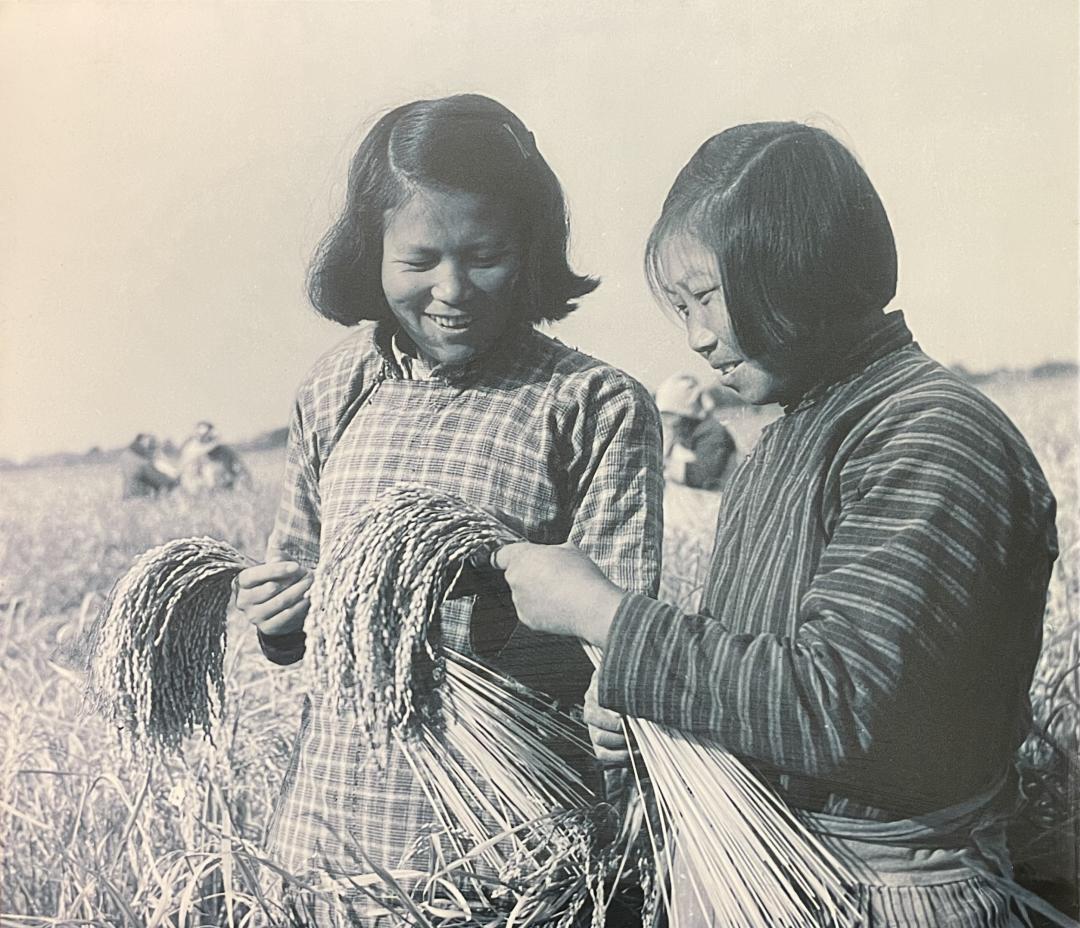 ▲新泾区诸华乡黎明农业生产合作社成员在田头选种。1955年11月