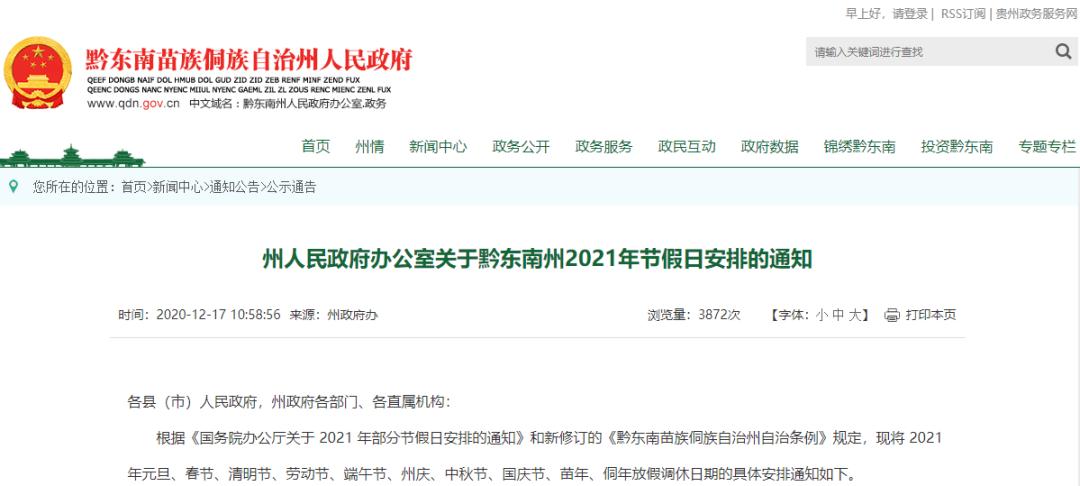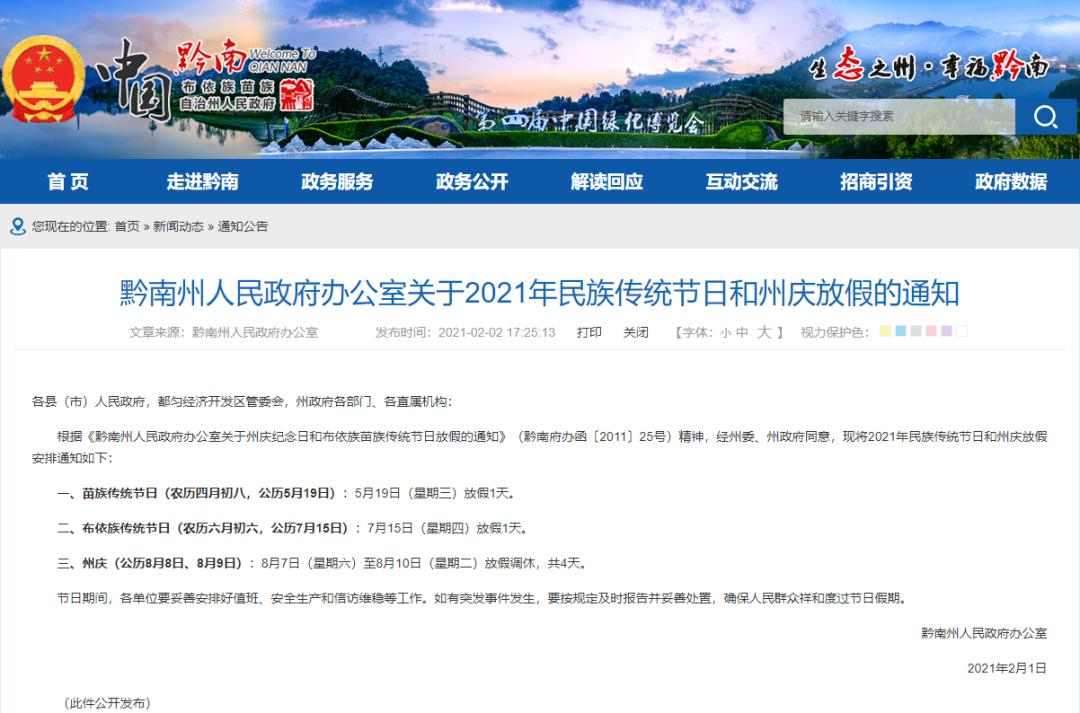 根据《黔南州人民政府办公室关于州庆纪念日和布依族苗族传统节日放假的通知》(黔南府办函〔2011〕25号)精神,经州委、州政府同意,现将2021年民族传统节日和州庆放假安排通知如下: