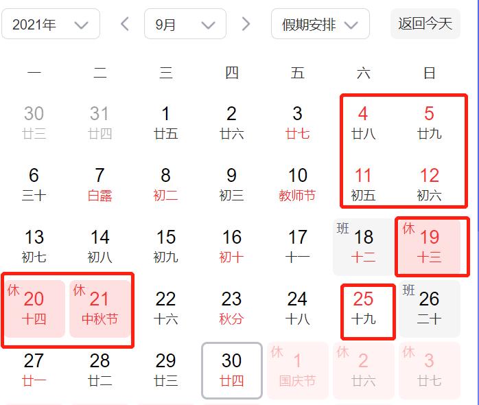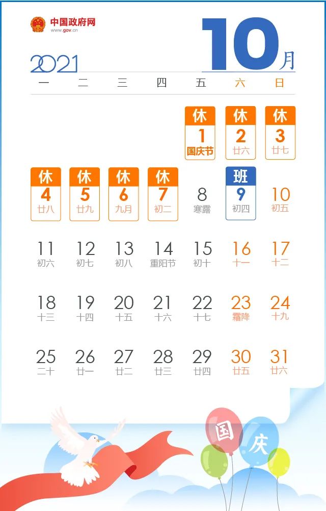 七、中秋节:9月19日至21日放假调休,共3天。9月18日(星期六)上班。