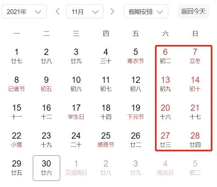 十、侗年:农历十一月初一(阳历12月4日,星期六),根据《条例》关于“自治州成立纪念日、苗年或者侗年如果适逢星期六、星期日,应当在工作日补假”的规定,12月6日(星期一)放假调休,共1天。