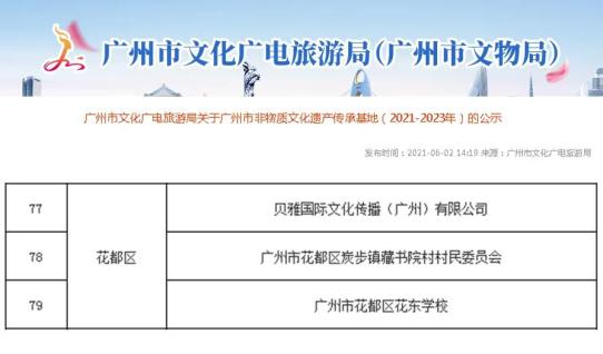 为加强广州市非物质文化遗产保护工作传承载体的建设,拓展社会各界参与非物质文化遗产保护的渠道,市文化广电旅游局开展了市非物质文化遗产保护传承基地(2021-2023年)申报工作。经自主申报、专家评审、实地考核等环节,我区炭步镇藏书院村村民委员会、花东学校、贝雅国际文化传播(广州)有限公司3家单位入选,成为广州市非物质文化遗产传承基地(2021-2023年)。01