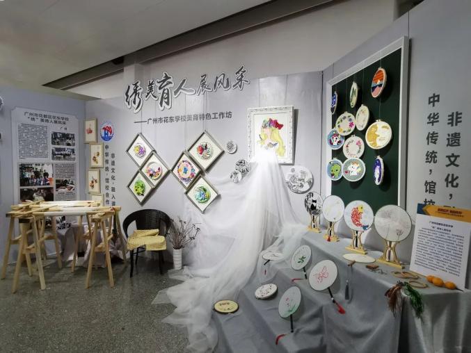 ▲花东学校“绣美”社团师生作品展示广州市花都区花东学校,同时也是广绣试点学校、第一批广绣传承实践基地、广州市民间文化传承基地,位于花都区花东镇象山村。为更好地传承传播广绣、钉金绣,花东学校在2018年组建了“绣美”社团,聘请该项目市级代表性传承人唐志茹等作为校外指导老师,定期向在校师生传授广绣和钉金绣技艺。