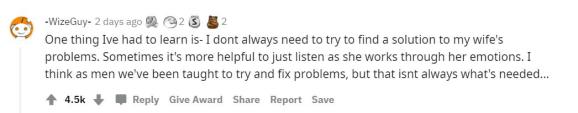 “我学会的一件事是:我并不总是需要给我妻子的烦恼提供一个解决方案。有的时候静静地听她倾诉、陪她整理好情绪,要更加有效。我觉得作为男人我们从小被教育要去解决问题,但有的时候别人并不需要你来提意见……”
