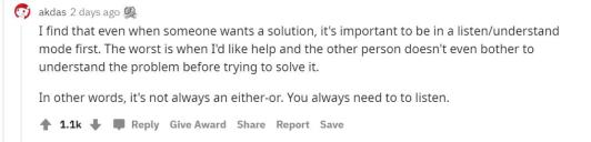 “我发现就算别人想听你的建议,你也要先仔细听/理解别人到底想说什么。最烦的情况就是我想让别人帮我,但对方压根不想弄明白我的问题到底是什么就开始乱提建议。
