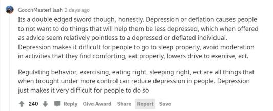 “这完全是一把双刃剑。抑郁症让人没有动力去做帮助自己缓解抑郁的事情,所以给抑郁症患者提意见看起来是一件没有意义的事。