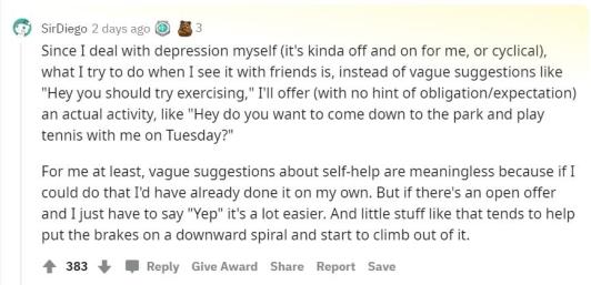 “自从我自己得过(间歇的)抑郁症之后,我就学会了如何去劝告别的患有抑郁症的朋友:不要直接提‘你应该去锻炼’这种比较模糊的建议,而是提议一个具体的行动,比如‘下周二你想和我去公园打网球吗?’