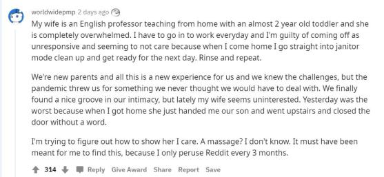 “我妻子是一个英语教授,她现在在家教网课,我们的孩子才不到两岁,她整天忙得筋疲力尽。我每天是要出门上班的,所以我就很愧疚常常不能第一时间回应妻子的需求。我看起来确实不太关心她,因为每天下班之后我就累得只剩洗洗去睡觉的劲。