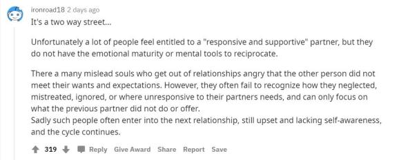 不幸的是,很多人觉得自己有资格拥有一个‘支持关爱自己’的伴侣,但他们自己却没有那个心理成熟度去同样回报他们的伴侣。