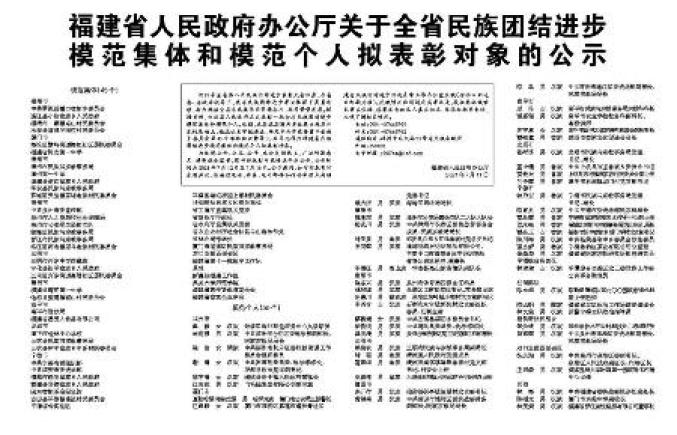 2015年全省第八次民族团结进步表彰大会以来,在省委、省政府领导下,我省民族团结进步事业取得了显著成绩,有力推动全省各民族共同团结奋斗、共同繁荣发展。根据安排,拟以省人民政府名义表彰一批全省民族团结进步模范集体和模范个人。近期,在各级各有关单位提出推荐对象的基础上,经过认真审核遴选,确定中共罗源县霍口畲族乡委员会等45个单位和洪静等55名同志作为福建省民族团结进步模范集体和模范个人拟表彰对象。