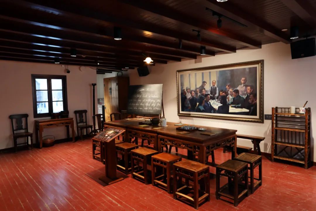 写满英文字母的小黑板、木桌椅、木地板等老上海石库门的元素,还原了当时会场召开的场景。地点:中共四大纪念馆场景再现厅二楼