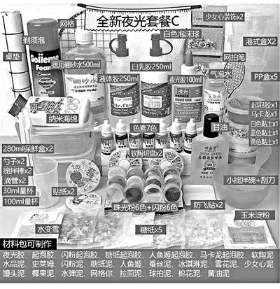 三年过去,水晶泥在电商平台仍销量不少。北青报记者检索多个电商平台发现,每个平台均有许多商家销售水晶泥、棉花泥、发泡胶、假水等此类玩具,还有商家销售自制此类玩具的材料包。这些产品有的按盒卖,每盒价格约2元,多数简易透明包装盒上没有产品说明、生产厂家和生产日期等信息,有的按礼盒套装卖,不同规格的套装价格从不足10元到400多元不等。