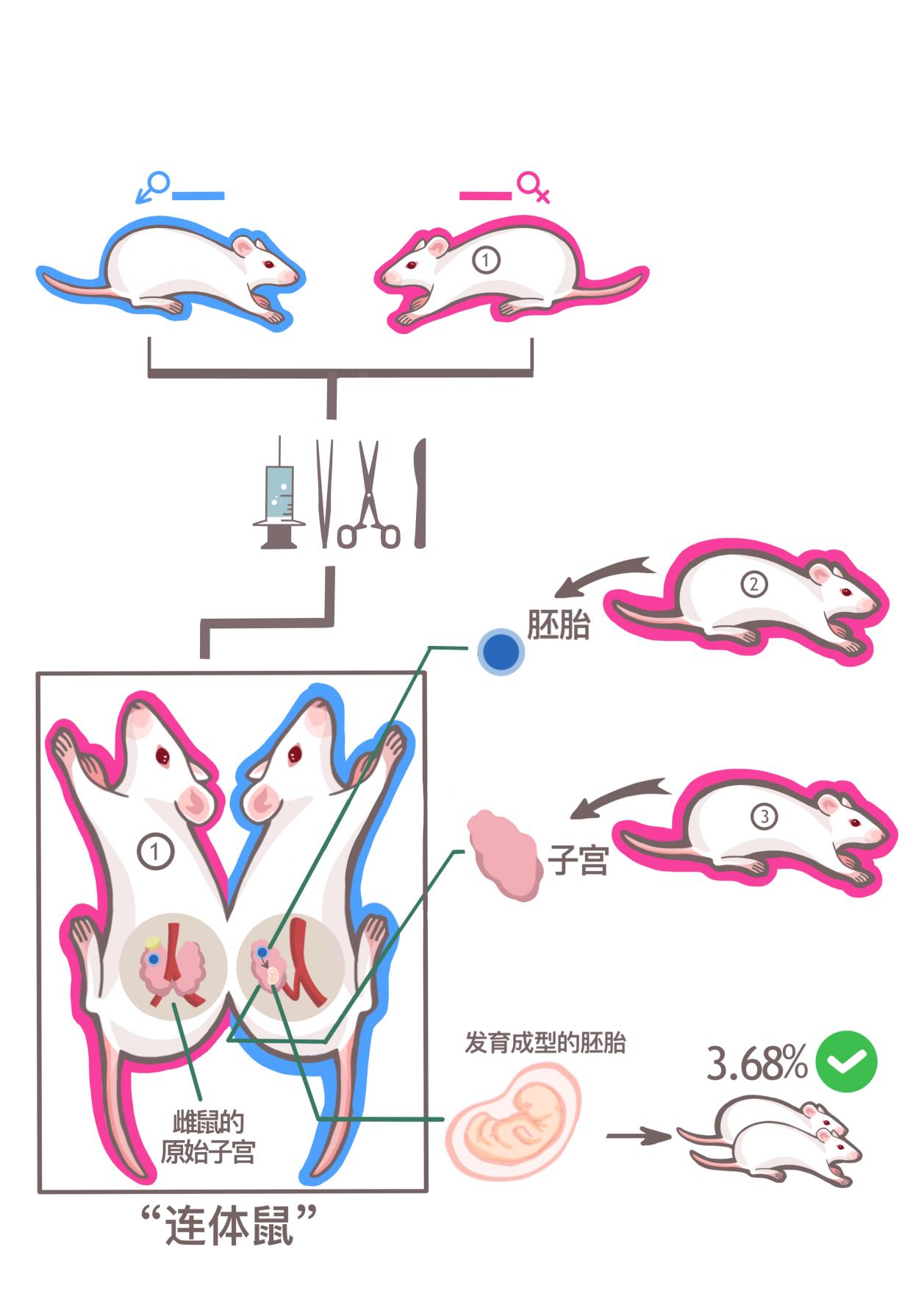 手术8周后,科研人员将另一只健康雌鼠的单侧子宫移植给“连体鼠”中的去势雄鼠。待其伤口愈合后,研究者从第三只雌鼠体内提取出胚胎,再将处于囊胚期的胚胎分别移植给“连体鼠”雄鼠的移植子宫和雌鼠的原生子宫里。