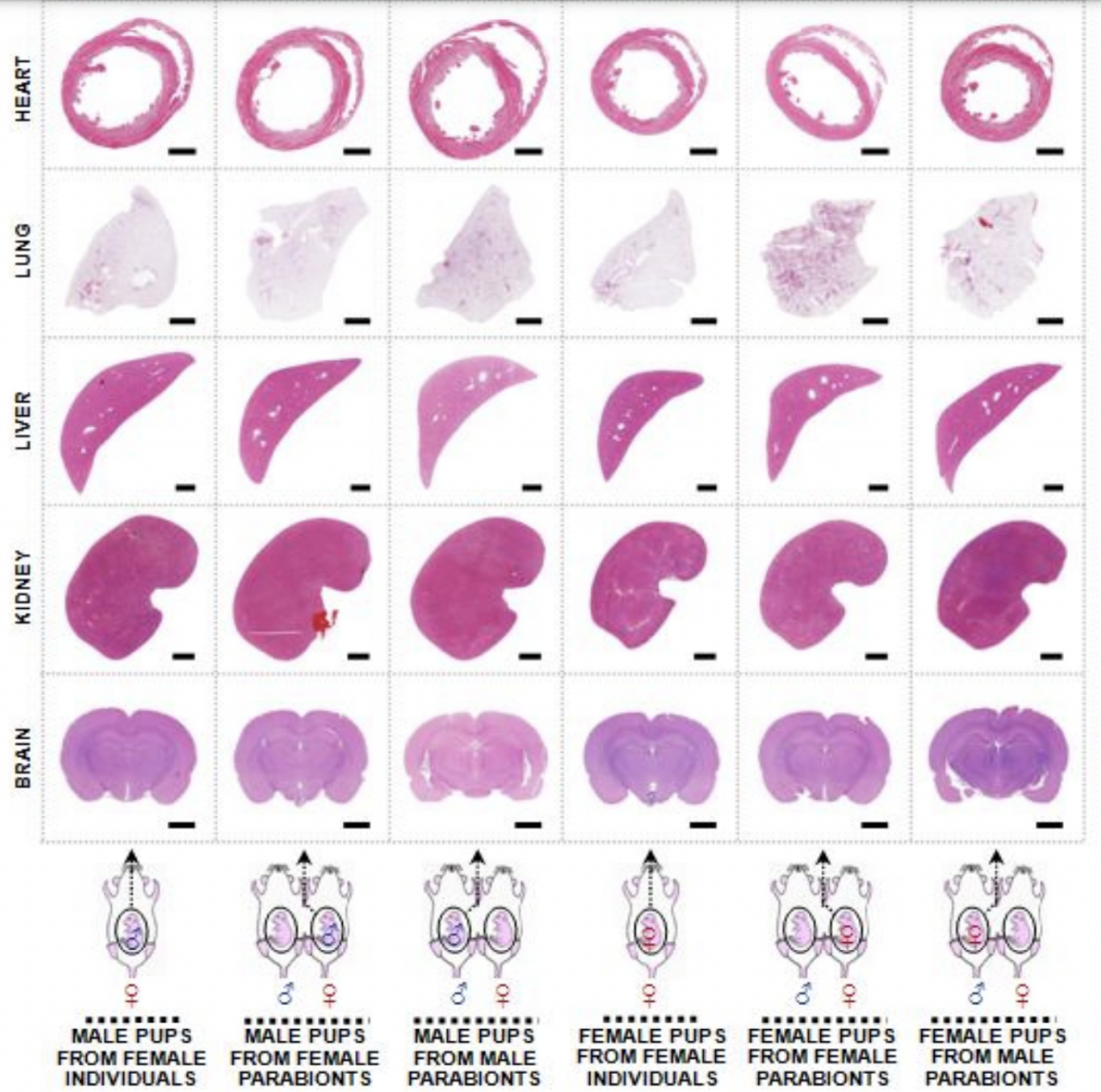 △ 研究者发现,由连体的雌鼠、雄鼠生育的幼崽,主要器官(如心、肝、脑、肾)未出现明显异常(图片来源:bioRxiv)