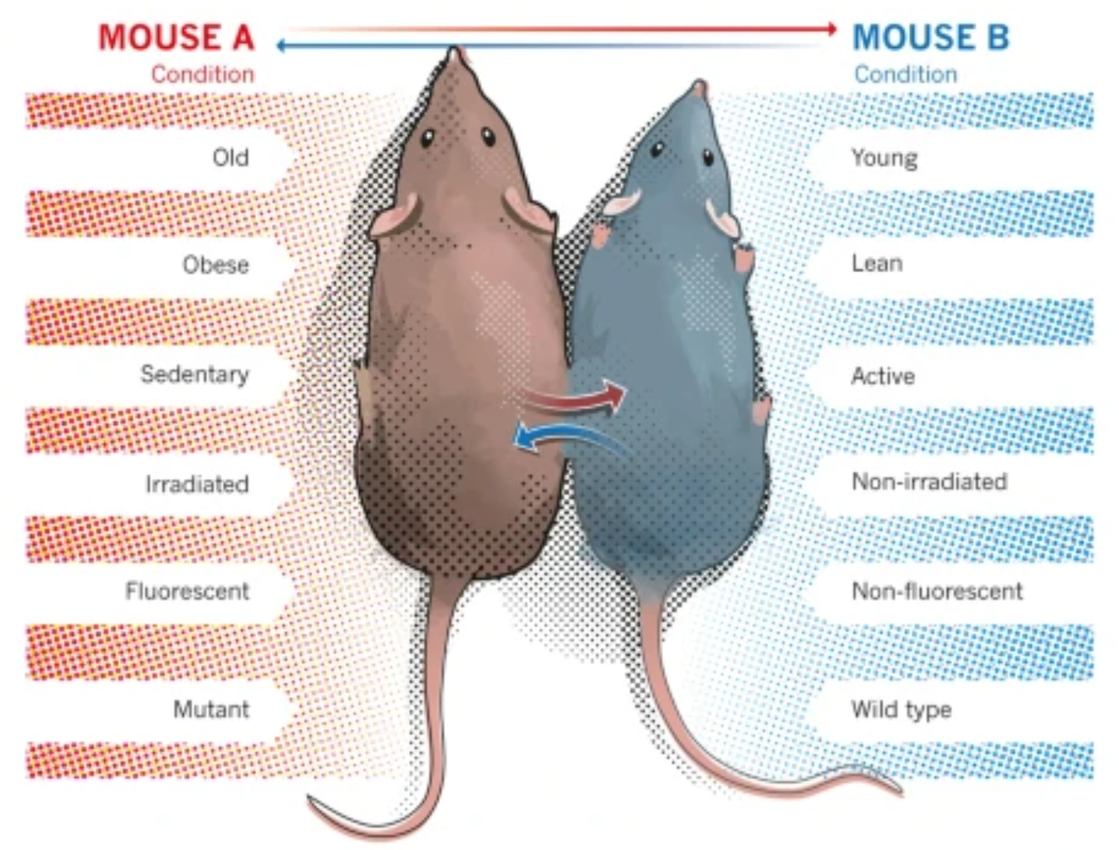 △ 连体鼠并非本研究首创。曾有研究者将老年和青年实验鼠“连接”,以开展生物体衰老机制方面的研究(图片来源:nature.com)