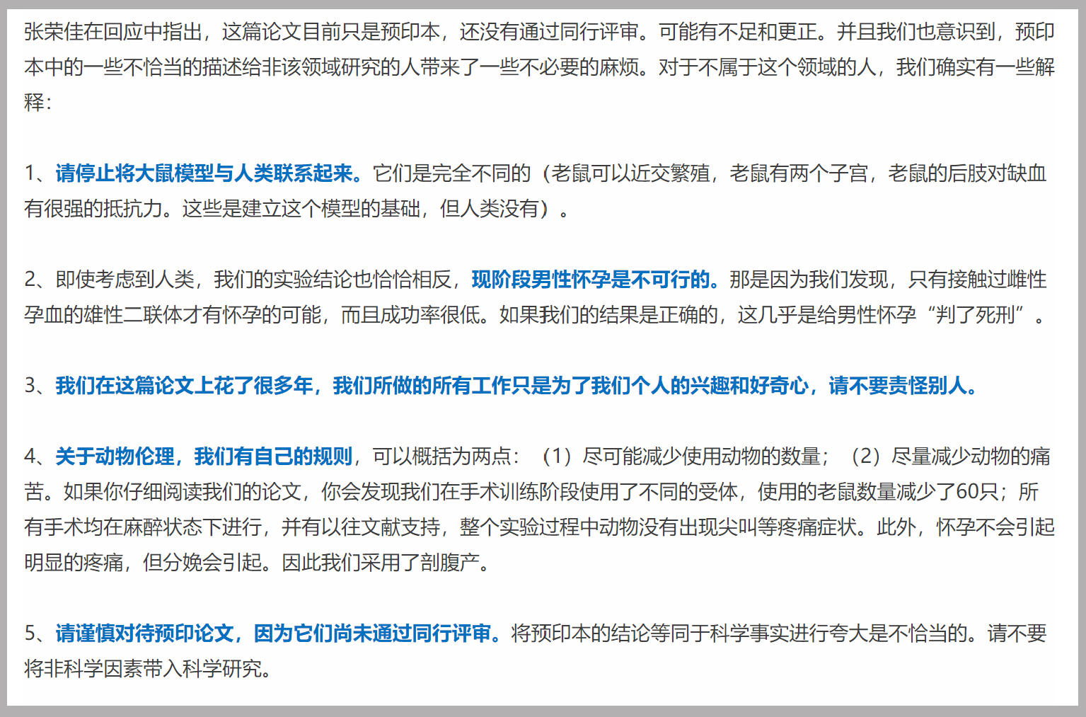 △论文第一作者张荣佳在PubPeer上解释,公众可能对研究结果有误解。“如果实验结果正确,这几乎是给人类男性怀孕(的想法)判了死刑”(本图是对PubPeer原文的翻译,来自“艾思学术”)
