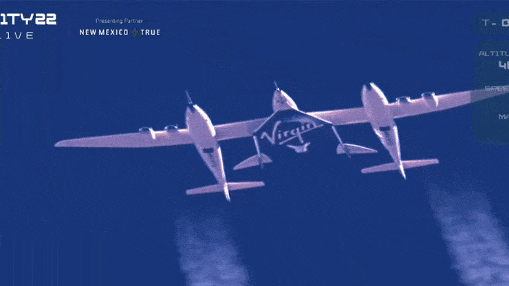 首先,飞机VMS Eve从美国太空港的跑道上起飞,下面载有航天器VSS Unity。