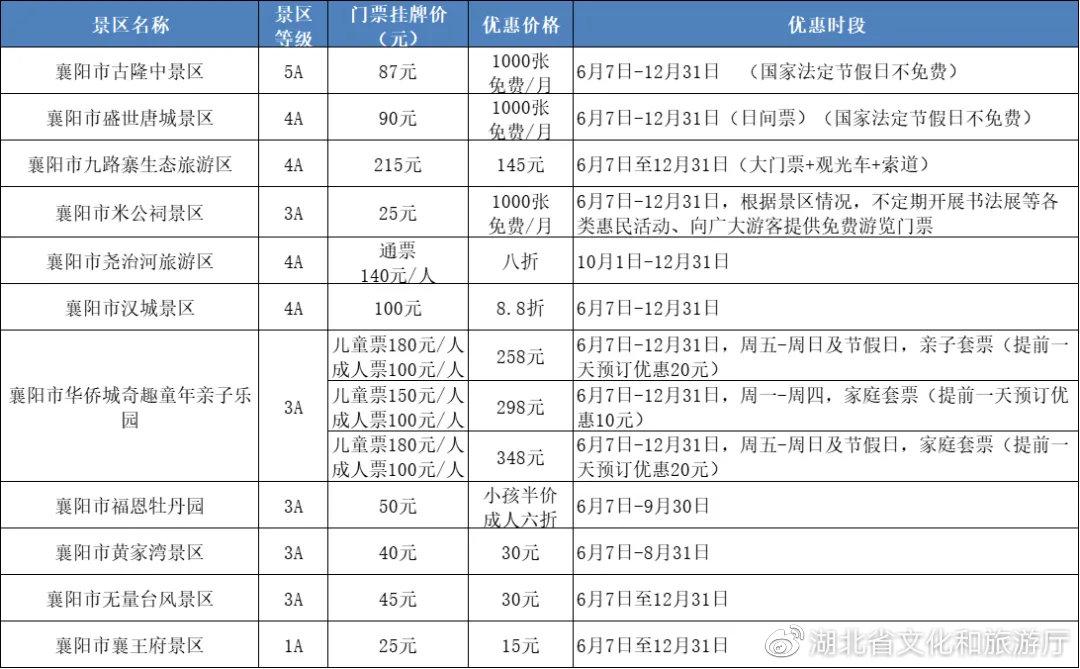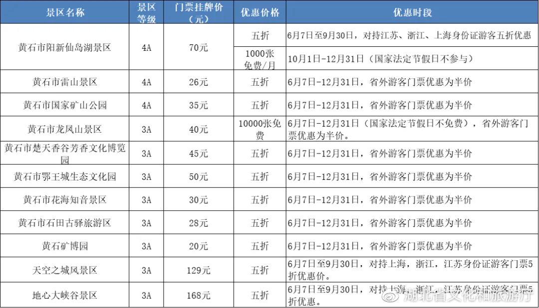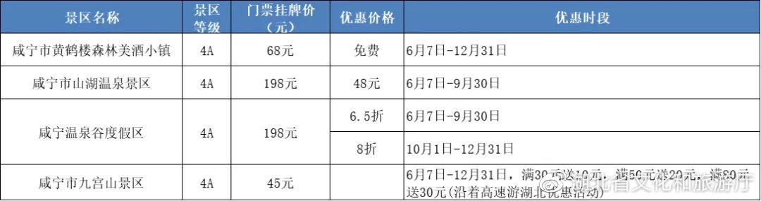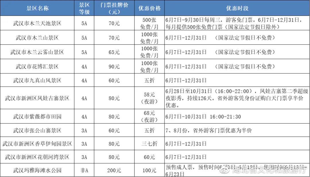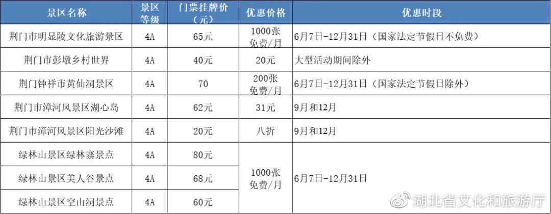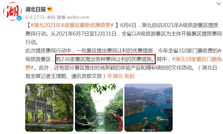 日前,湖北启动了2021年A级旅游景区提质惠民行动,从6月7日至12月31日,全省以A级旅游景区为主体开展景区提质惠民行动。今年全省310家收费A级景区,有236家推出各种优惠措施。其中,湖北18家景区免门票、49家景区门票5折、63家景区门票6折至9折、111家景区二次消费优惠或推优惠套餐……