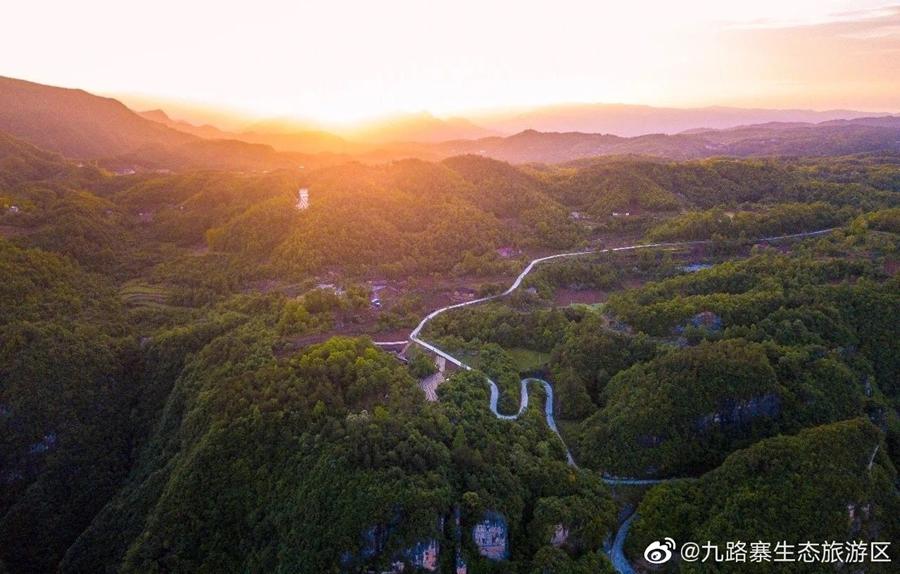 九路寨地形奇特,河、谷、石、林、瀑、洞兼有,景色可以与张家界、九寨沟媲美。迄今为止,在景区内发现了100多处有超高观赏价值的景点,比较壮观有黄龙洞、象鼻山、佛祖望瀑、一线天、天马山、天桥。