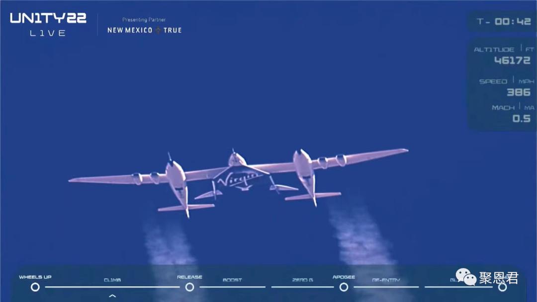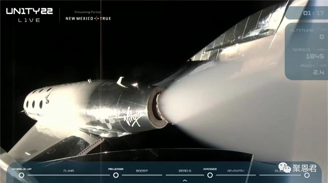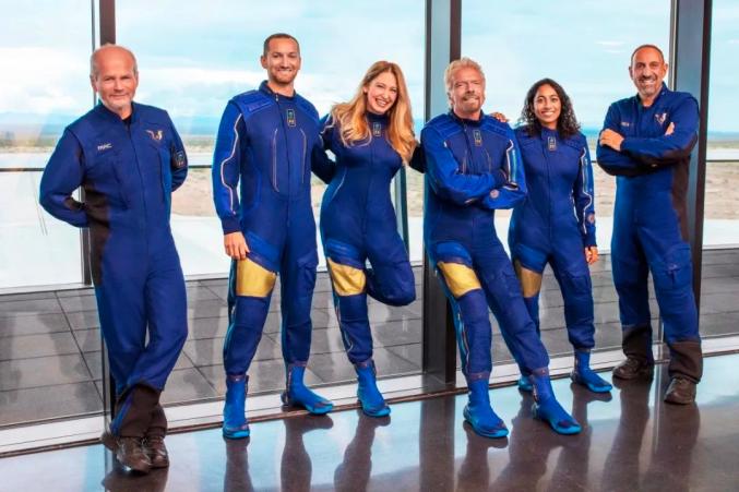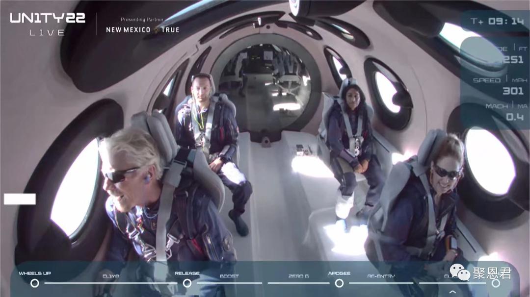 布兰森(右三)和此次飞行机组成员北京时间7月11日晚23点25分,71岁的的英国富翁、维珍集团创始人、探险家理查德·布兰森布兰森,乘坐他麾下的维珍银河公司研制的“太空船二号”亚轨道飞行器,由母机“白骑士二号”带至14000米高空投放,而后启动火箭发动机,加速到3倍声速,即3800km小时,飞升到距地面约86km的高空,在微重力环境中悬浮数分钟。他和他的乘员们在感受失重的奇妙,透过舷窗回望美丽的地球家园后,调整飞行器姿态,滑翔返航,再入稠密大气,像飞机一样,水平着陆在美国新墨西哥州太空港的跑道上。全部飞行过程持续近1个小时。
