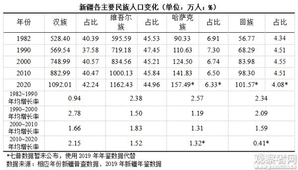 建国后新疆人口转变过程就民族人口来看,新疆有四个民族人口超过百万,分别是汉族、维吾尔族、哈萨克族和回族,这四个民族人口合计占新疆人口的95%以上。从1982年新疆历次普查数据可以看到,这四个民族的人口规模都在增长,但增长速度有波动且有所放缓;汉族以流动人口增长为主,少数民族以自然增长为主,其中维吾尔族在新疆地区人口自然增长最快。实际上,即使在全国少数民族中,维吾尔族也是人口增速最快的民族之一。