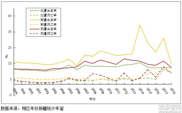 南、北、东疆1998-2018年人口出生率、死亡率变化过程李建新:按照新疆统计年鉴数据,2014年南疆一些地区的出生率陡增,如喀什地区的人口出生率高达65‰以上。正常情况下,这是不可能的。通过进一步了解,原来实际情况是那些年喀什地区存在着较大范围的瞒报漏报,后来“访惠聚”工作组下乡纠偏核查,这一现象才得以遏制,并进行了大规模的补报,而补报的数据都统计在了2014年,于是使得2014年的出生率出现陡增。