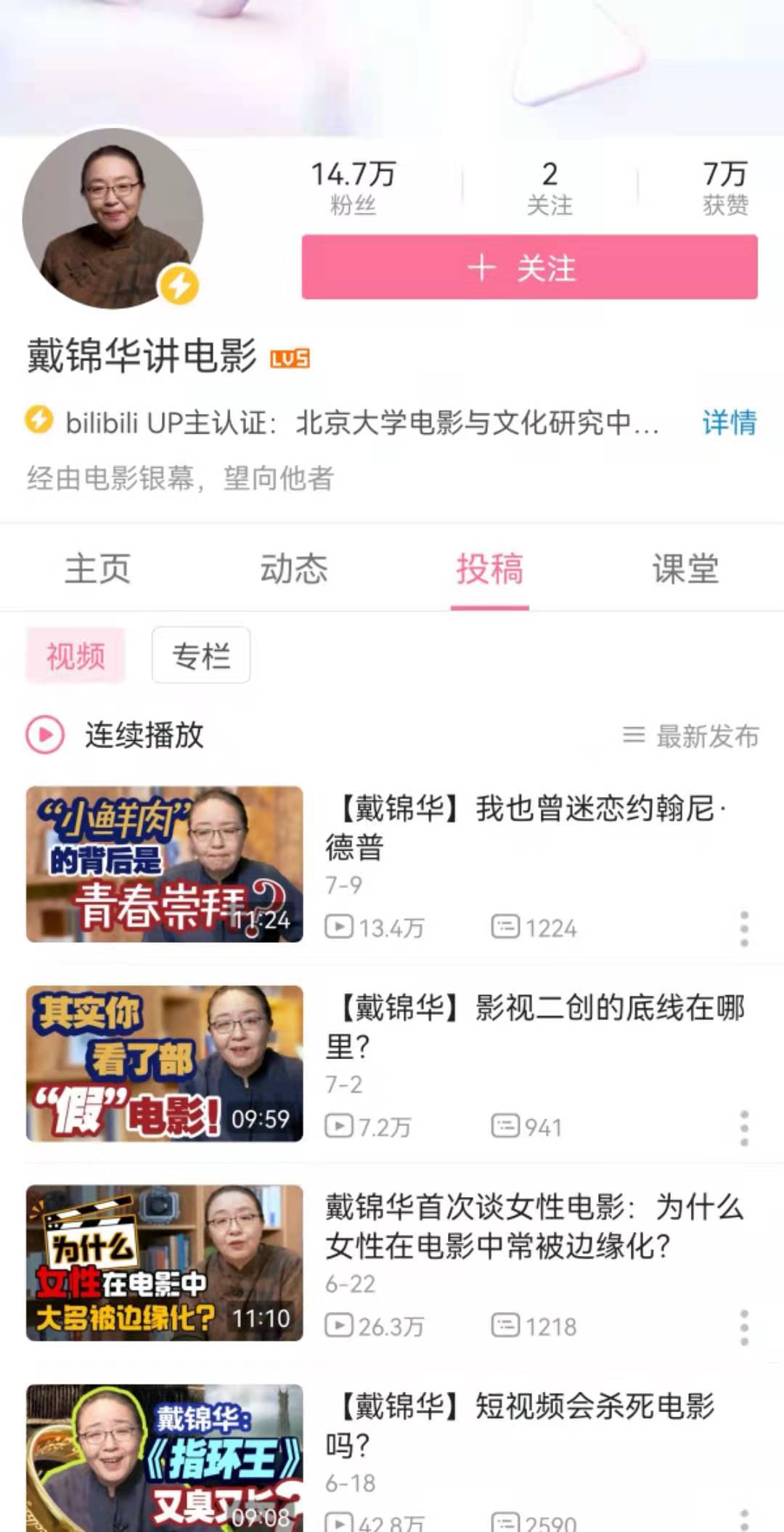 “电影于我而言是一个美丽的、充满召唤的入口,经由这个入口,我们走向世界、走向他者,从而重新认识我们自己。”在北京大学教授戴锦华最近开设的B站账号中,她这样写道。