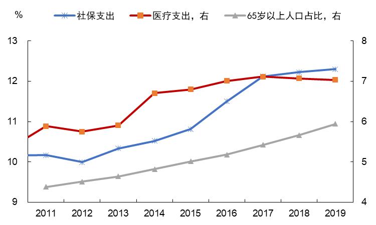 数据来源:Wind图11一般公共预算社保、医疗支出占比和老龄人口占比变化