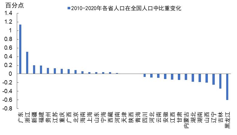 根据第六次和第七次人口普查数据,2010-2020年间,主要是人口流动等因素影响,各省市人口占比的变化出现较大分化,广东提高1.1个百分点,提升幅度远高于其他省市。而东北地区以及山西、湖南等省份人口占全国人口的比重出现了较大幅度的下降。