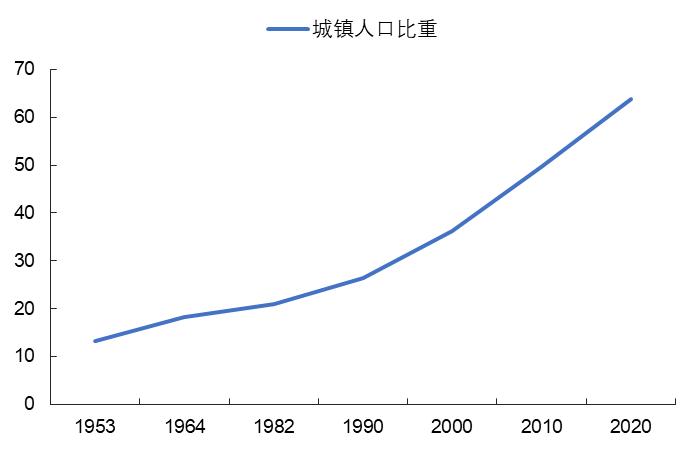 数据来源:Wind二是城乡间人口比例结构表明,城镇化或将放缓,财政支出结构将有所变化。从第一次人口普查(1953年)到第七次人口普查(2020年)期间,中国城镇化加速推进,城镇人口占总人口的比重从13.3%大幅提升到63.9%。“十四五”规划提出了城镇化率65%的目标,目前距离这一目标仅相差1.1个百分点。然而,从美国和日本城市化的进程来看,两国均在城市化率70%左右时进入了城市化进程显著放缓的阶段。若以美、日两国为参照,中国城市化率也在逐步逼近这一平台期。