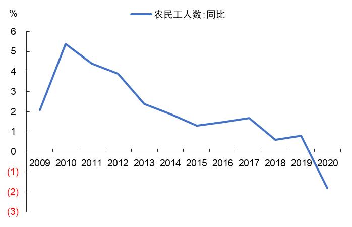 事实上,考察农民工这一过去支撑城镇化的主力群体变化情况,中国城镇化已有放缓迹象。从2011年开始,农民工同比增速呈现逐步回落的趋势,2019年农民工同比仅增长0.8%,2020年受疫情冲击农民工人数更是出现了负增长。