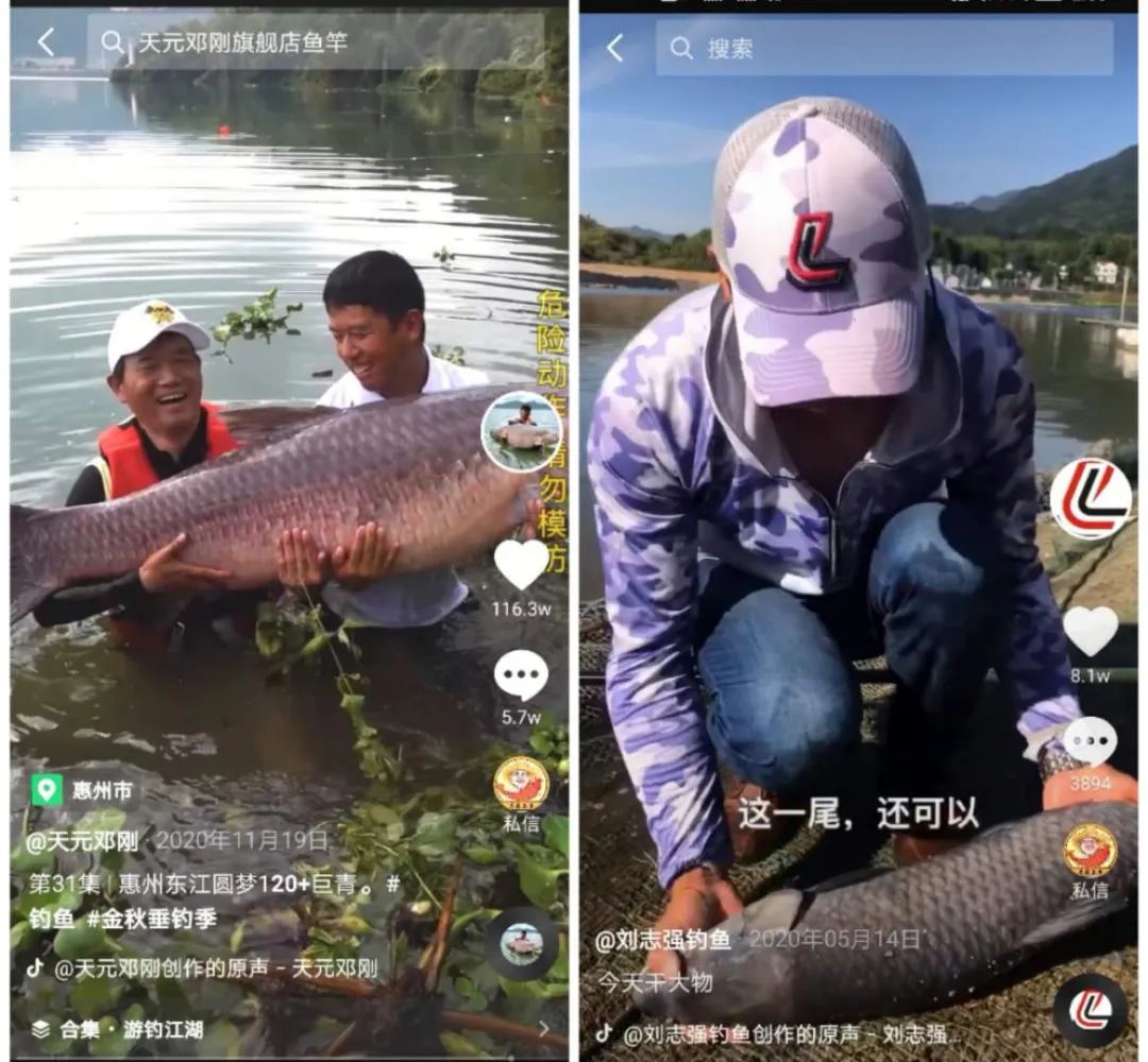 钓鱼类短视频的火爆,让一批钓鱼“大神”迅速走红。全国钓鱼锦标赛冠军邓刚的账号“天元邓刚”,拥有近2000万粉丝,而“刘志强钓鱼”“职业钓手曾晖”等头部账号,粉丝数量均达到了几百万。