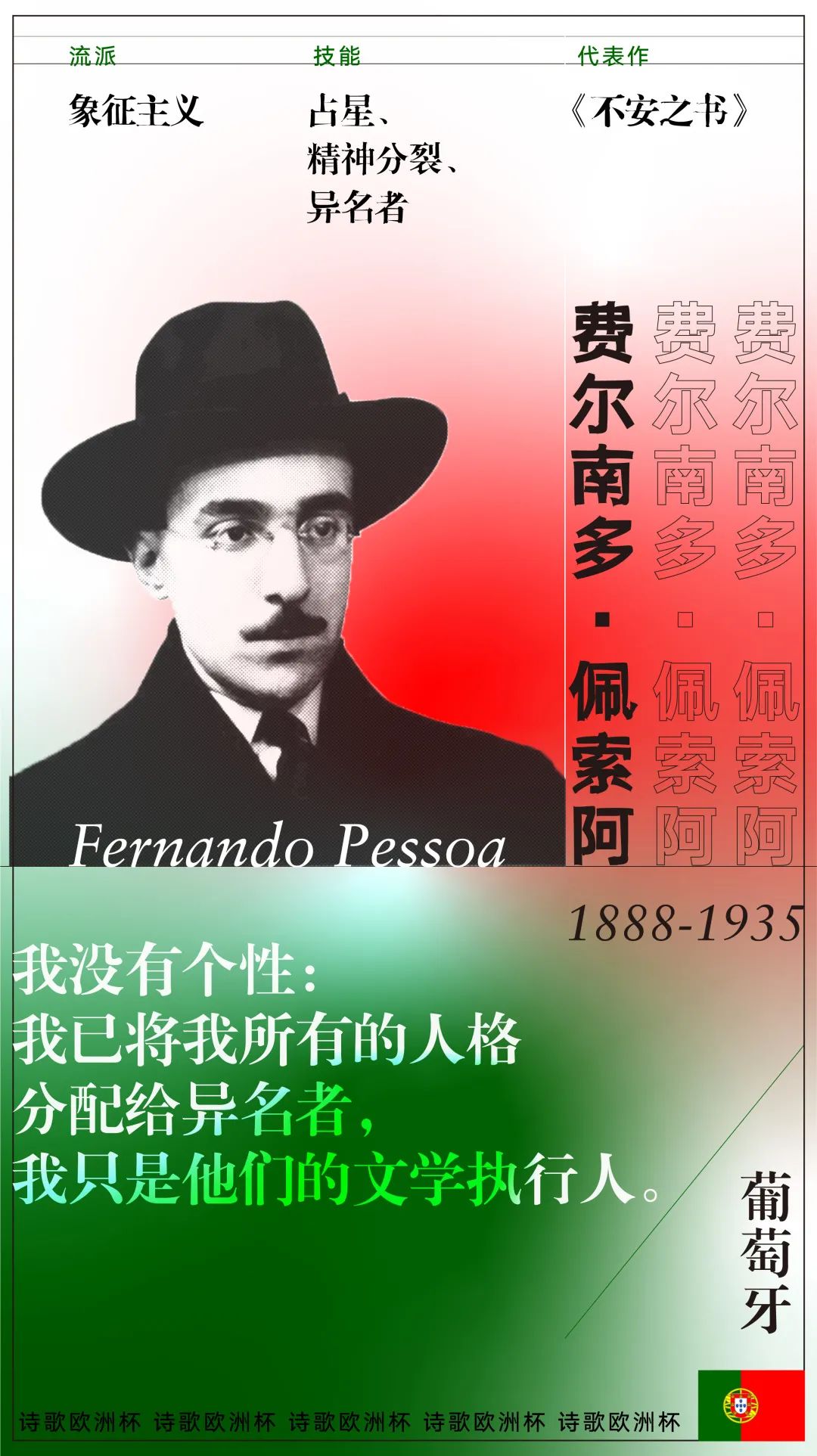 生于葡萄牙里斯本,以诗集《使命》而闻名于世,被认为是继卡蒙斯之后最伟大的葡语作家。一生只谈过一次恋爱,却把人生写得荡气回肠。“我们活过的刹那,前后皆是暗夜”“我们从未爱过任何人。我们爱的是对某人的看法,是我们自己的观念——即我们自己。”自我分裂写作的集大成者,译者闵雪飞评“一个有意思的神经病”。诗学世界的王者,却是世俗世界的失败者。一生甘愿“无为”,“他的一生除了他的诗歌,毫无惊人之处”是最刺耳的否定,也是最极致的褒扬。