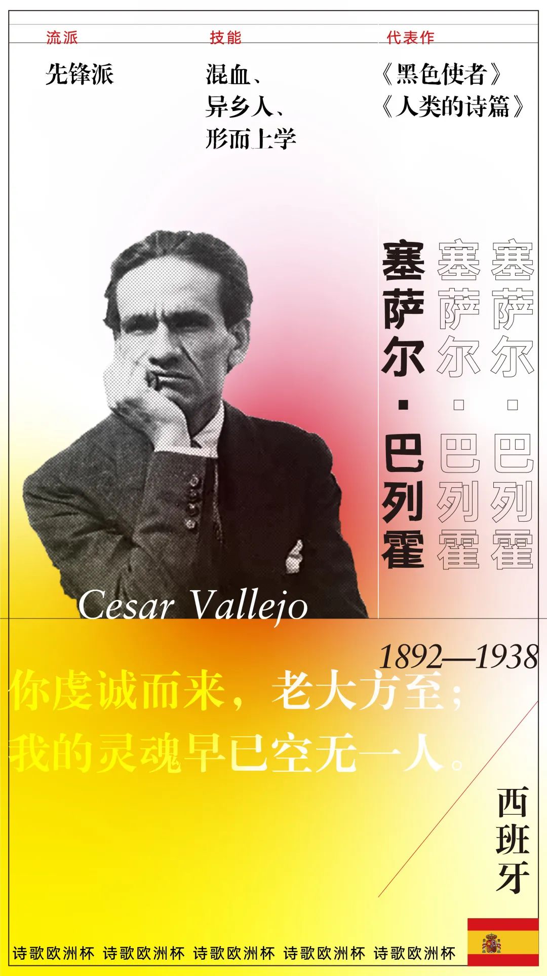 出生于秘鲁,是拉丁美洲最重要的诗人之一,其诗歌创作是整个西班牙语先锋派诗歌的里程杯。西班牙与印地安混血,基督教与印第安文化杂糅,家庭宗教气氛浓厚,被形而上的世界渗透了一生。一生历经困苦磨难,经济窘迫。“生活中有些打击,很沉重......我不知道!”少时差点走上神职人员的道路,但因无法忍受不能有女人而放弃。一边怀着对女性的依恋,经历着情爱,一边最终去了远方。