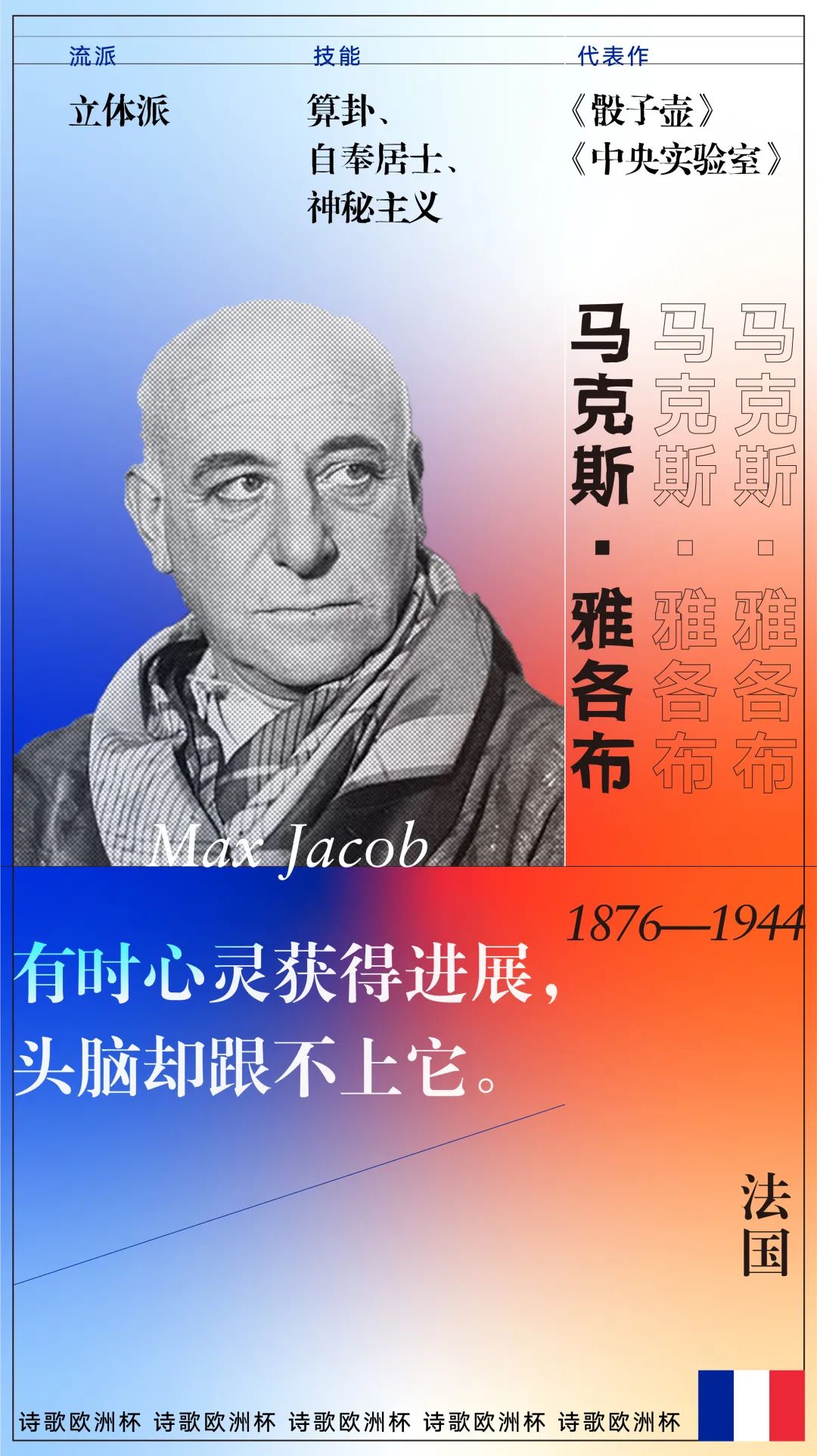 用语言编织的诗歌若也有欧洲杯,那肯定少不了法语诗人马克斯·雅科布;葡语诗大概会派出象征主义诗人庇山耶,佩索阿;英文诗中的艾米莉·狄金森、阿什贝利也会参赛;